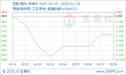 据生意社商品分析系统显示:2月10日开始,利空打压,豆粕行情上涨过后迎来回调,上演弱势下跌行情。2月10日,豆粕市场均价3872元/吨,2月18日,豆粕市场均价3702元/吨,价格下跌4.39%。