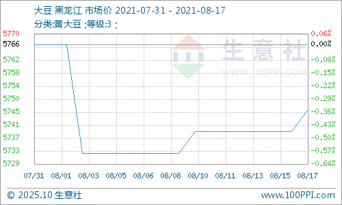 据生意社监测数据显示:8月3日开始,国产大豆行情小幅上涨。3日,国产大豆市场均价5733元/吨,8月17日国产大豆市场均价5746元/吨,价格上涨0.23%。