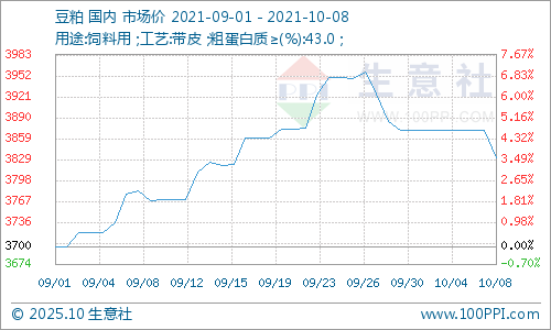 据生意社数据监测:国庆节日期间,外盘大豆、豆粕行情下跌。节后,连豆粕应声下跌,豆粕开盘3370元/吨,下跌98元/吨。现货跟盘下跌,主流报价3832元/吨,下跌超1%。终端饲料需求疲软,水产养殖步入淡季,豆粕价格弱势下跌。因大豆油厂限电检修,豆粕供应偏紧。预计后市豆粕下跌空间受限。